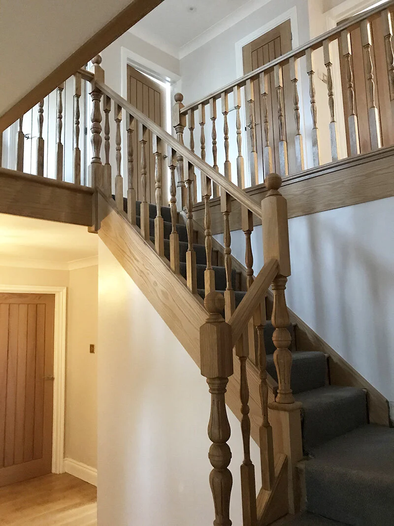 Original pine staircase completely transformed with solid oak turned newel posts, spindals, handrails and oak veneered stair strings and aprons.